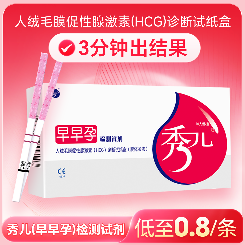 | 产品品名 | 人绒毛膜促性腺激素(HCG)诊断试纸盒(胶体金法)(秀儿)(早早孕)检测试剂 |