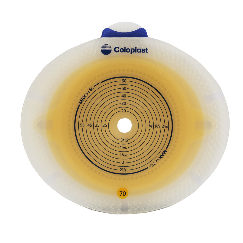【使用方法】 准备:根据造口的大小和形状确定底盘的中心剪孔,使之与造口的大小和形状匹配。使用弯剪按照底盘上的剪切刻度剪裁,会更容易完成剪孔。可以使用附赠的造口测量尺测量造口的大小和形状,为了减少渗漏和皮肤问题孔径和造口完全匹配是非常重要的。 彻底清洁造口及造口周围皮肤,在佩戴底盘的过程中,应保持皮肤完全干燥。 佩戴:去除粘胶保护纸。 将底盘对准造□,平整地贴在皮肤上。 粘胶必须紧密贴合于造口周围。为了防止渗漏,确保造口周围密封是很重要的当技压腹部的底盘/造口袋时,先从造口周围开始,按压底盘粘胶,使其紧贴皮肤。用手指按压造口周围一圈,确保粘胶已紧密贴合向下抚平粘胶,从造口向底盘边缘按压,保证粘胶与皮肤完全接触。 关于如何使用造口袋,请查阅相关造口袋的说明书。 处理:本产品为一次性使用产品,应根据当地规定(作为生活垃圾)处理。不要丢弃在冲水马桶中。