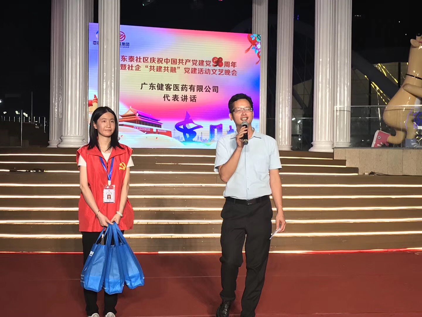 为庆祝建党98周年,进一步密切社区与共建单位之间的沟通与联系,促进党建工作水平的提升。6月28日晚,东莞市东城街道和东泰社区在民盈·国贸城举办了“引领新风尚,讴歌新时代”庆祝中国共产党建党98周年暨社企“共建共融”党建活动文艺晚会。东城街道刘林宏党委书记、周日佳党委副书记及相关领导、市委组织部部务会成员、副处级组织员许垂龙、健客CEO谢方敏、健客副总裁、党支部书记杨时青等参加了活动,现场共有200余人一同感受晚会的热闹气氛。